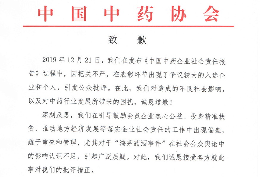 鸿茅药酒 致歉信