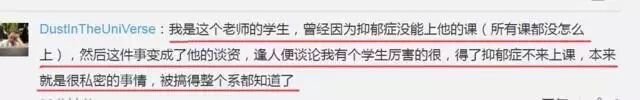 无独有偶,这位老师并不是第一次喜欢拿别人的隐私来说话,有该老师的学生 @DustInTheUniVerse 出来爆料,他声称是这位老师的学生,因患有抑郁症,没能来上这位老师的课,结果被老师当做谈资,遇人就说,丝毫不顾忌个人隐私,弄得整个系的人都知道。(该微博已删除)