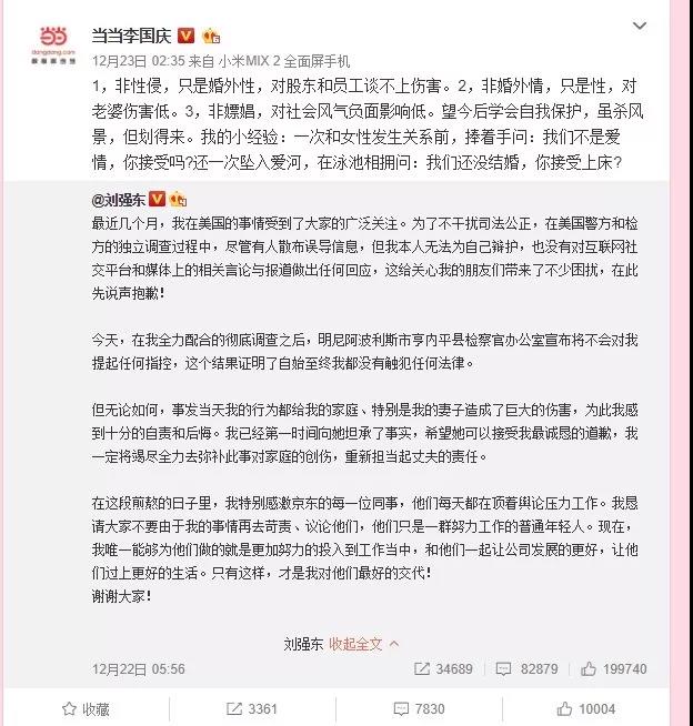 据了解,12月23日凌晨2:35,李国庆在微博上转发刘强东的公开声明,针对刘强东明尼苏达事件发表点评称:“1,非性侵,只是婚外性,对股东和员工谈不上伤害。2,非婚外情,只是性,对老婆伤害低。3,非嫖娼,对社会风气负面影响低。望今后学会自我保护,虽杀风景,但划得来。我的小经验:一次和女性发生关系前,捧着手问:我们不是爱情,你接受吗?还一次坠入爱河,在泳池相拥问:我们还没结婚,你接受上床?”。