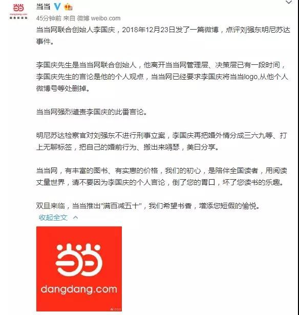 当当网称,李国庆离开当当网管理层、决策层已有一段时间,该言论是他的个人观点不代表当当网的立场。当当网已经要求李国庆将当当logo,从他个人微博号等处删掉。当当网强烈谴责李国庆的此番言论。明尼苏达检察官对刘强东不进行刑事立案,李国庆再把婚外情分成三六九等、打上无聊标签,把自己的婚前行为、搬出来嘚瑟,美曰分享。