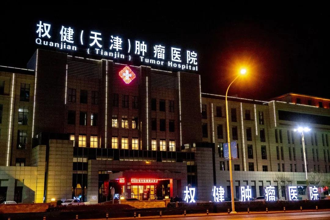 天津市武清区京福路上,沉沉夜幕下的权健(天津)肿瘤医院。| 图:视觉中国