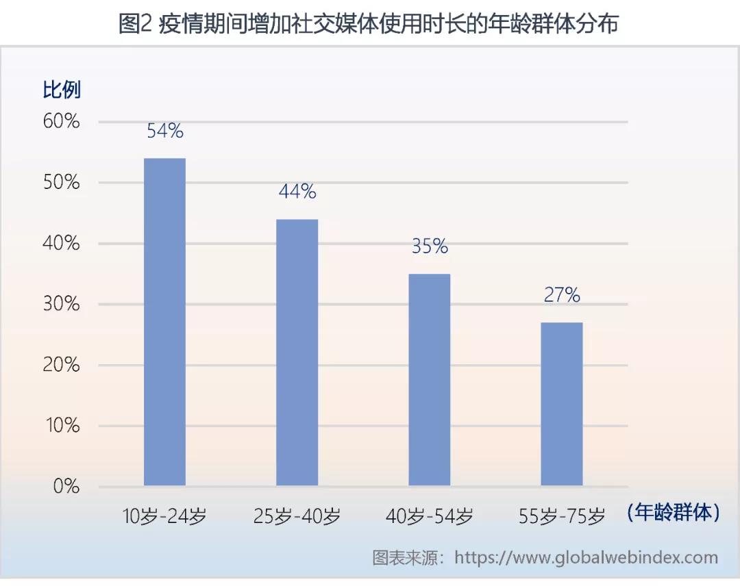 疫情爆发后,社交媒体用户黏性增强,人们越来越多地依赖社交媒体维护社交关系、获取新闻资讯。2020年,全球社交媒体活跃用户高达42亿,占全体互联网用户的90%[23]。世界范围内,用户平均每天在社交媒体上花费的时间已超过2小时40分钟[24],而疫情的扩散无疑加速了这一数字的上涨,54%的Z世代群体(10~24岁)和44%的千禧一代群体(25~39岁)表示疫情增加了其使用社交媒体的频率(见图2)。
