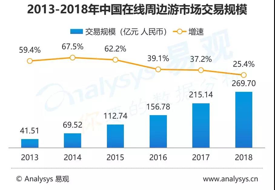 2018年中国在线周边游市场交易规模持续增长,达到269.7亿元人民币,增幅25.4%,增幅远高于旅游产业整体。