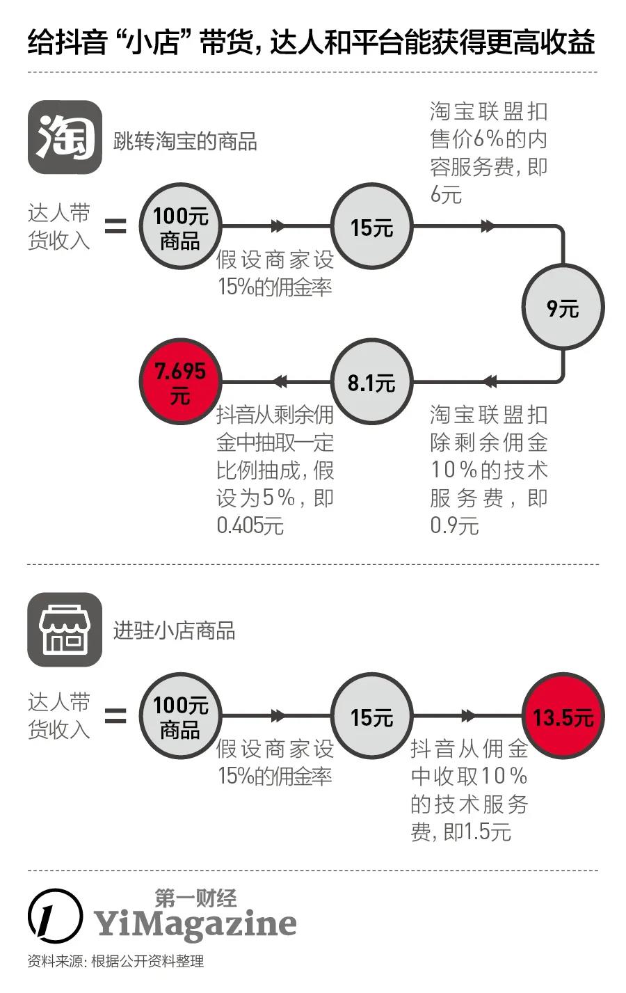 达人如果为抖音小店带货所获得的佣金收入,抖音从中抽取10%作为技术服务费。总体上后一种带货,达人和抖音能分到的佣金收入明显要高于前一种。