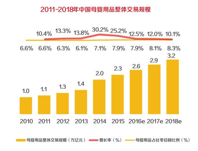 21世纪经济研究院发布的《2016母婴产品消费趋势报告》显示,2015年国内母婴市场规模达2.3万亿,同比增长25.2%,预计2018年母婴市场整体容量将扩张到3.2万亿 。